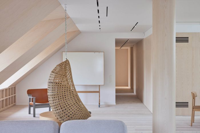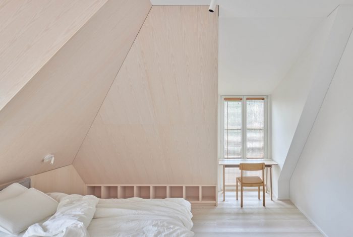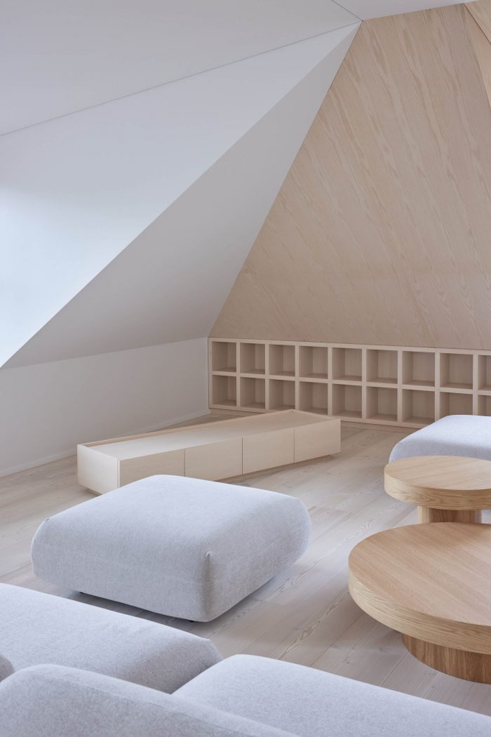The attic space gives the apartment a unique feel but also poses some challenges. Deep window openings and small windows create cozy attic spaces but limit the ingress of light into the rooms. As a result, the color palette of the interior was chosen to be bright, warm, natural.