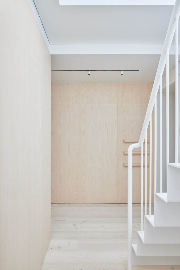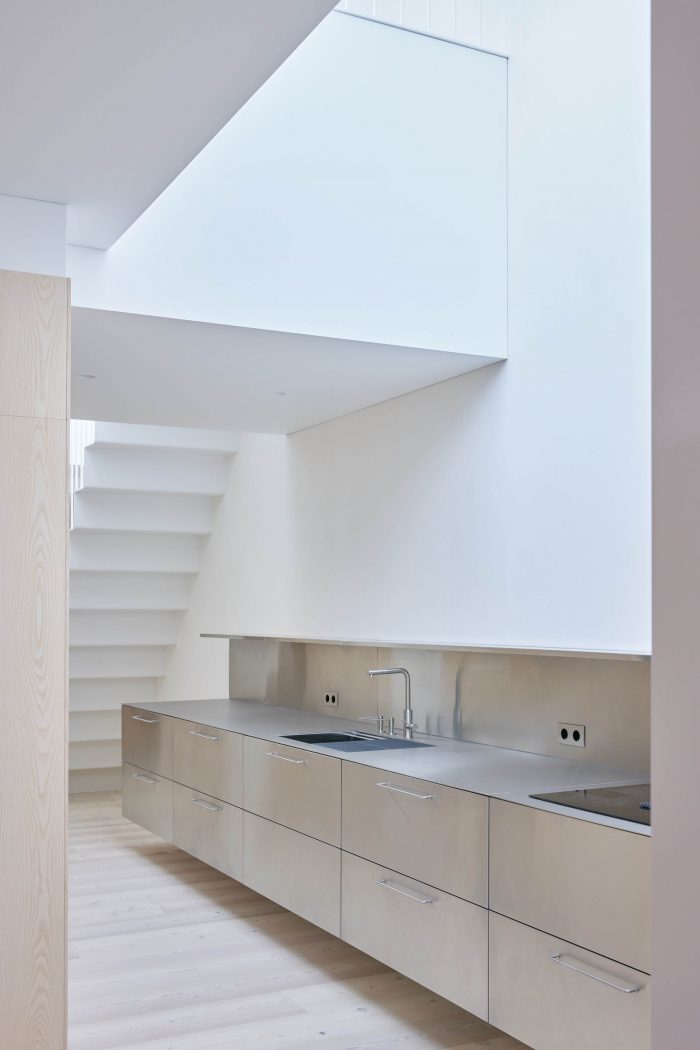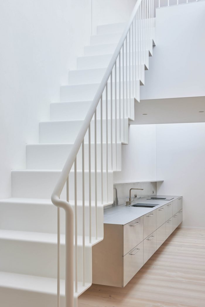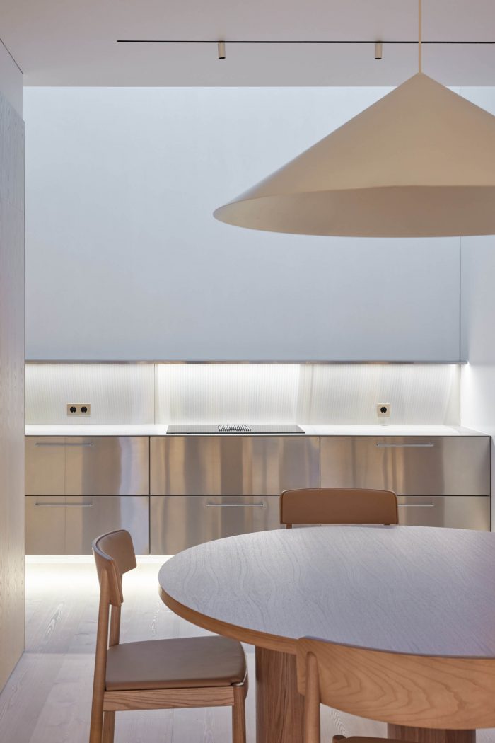 The exit to the roof terrace brings light to the darkest part of the apartment. Here, next to the stairs is a kitchen flooded with natural light. The kitchen connects with the living room, where all the main functions of family life, work, and leisure are spaciously scattered.