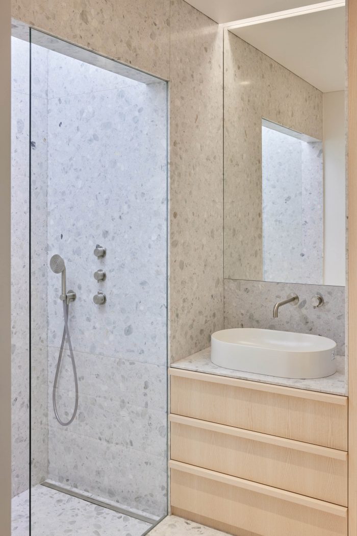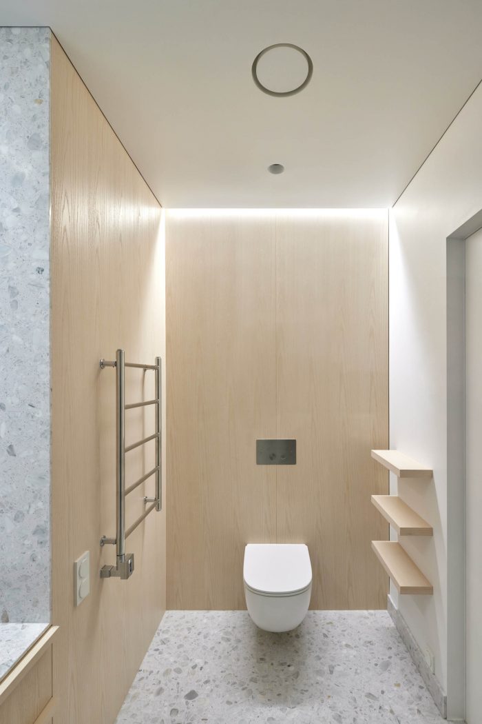 Only real materials are used in the interior - natural wood, natural stone terrazzo tiles, clay plaster, stainless steel. The interior combines wood surfaces of different types and shades - bleached larch parquet is used for the floor, light ash is used for wall covering, and the wooden furniture is made of natural oak.