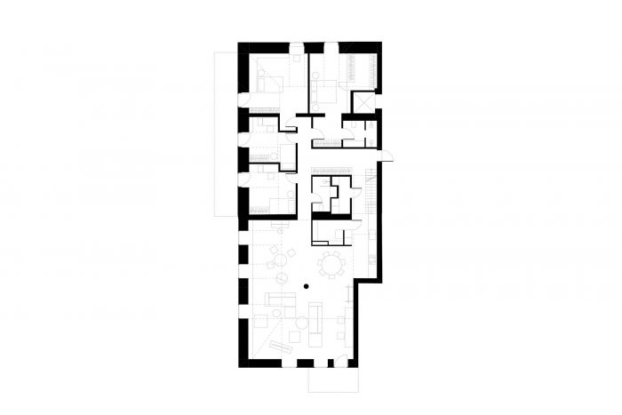 A home for a large family was designed in Zverynas - the greenest district of Vilnius. The building has an interesting history – in 1860 it was the first brick building in a district that was entirely consisting of wooden architecture. The building was originally built as a factory, after that, it changed to use a couple of times to host a co-living space, cinema studio, archive and was later abandoned. In 2018 it was renovated and some new construction was added to create a luxury apartment complex in the green center of Vilnius.